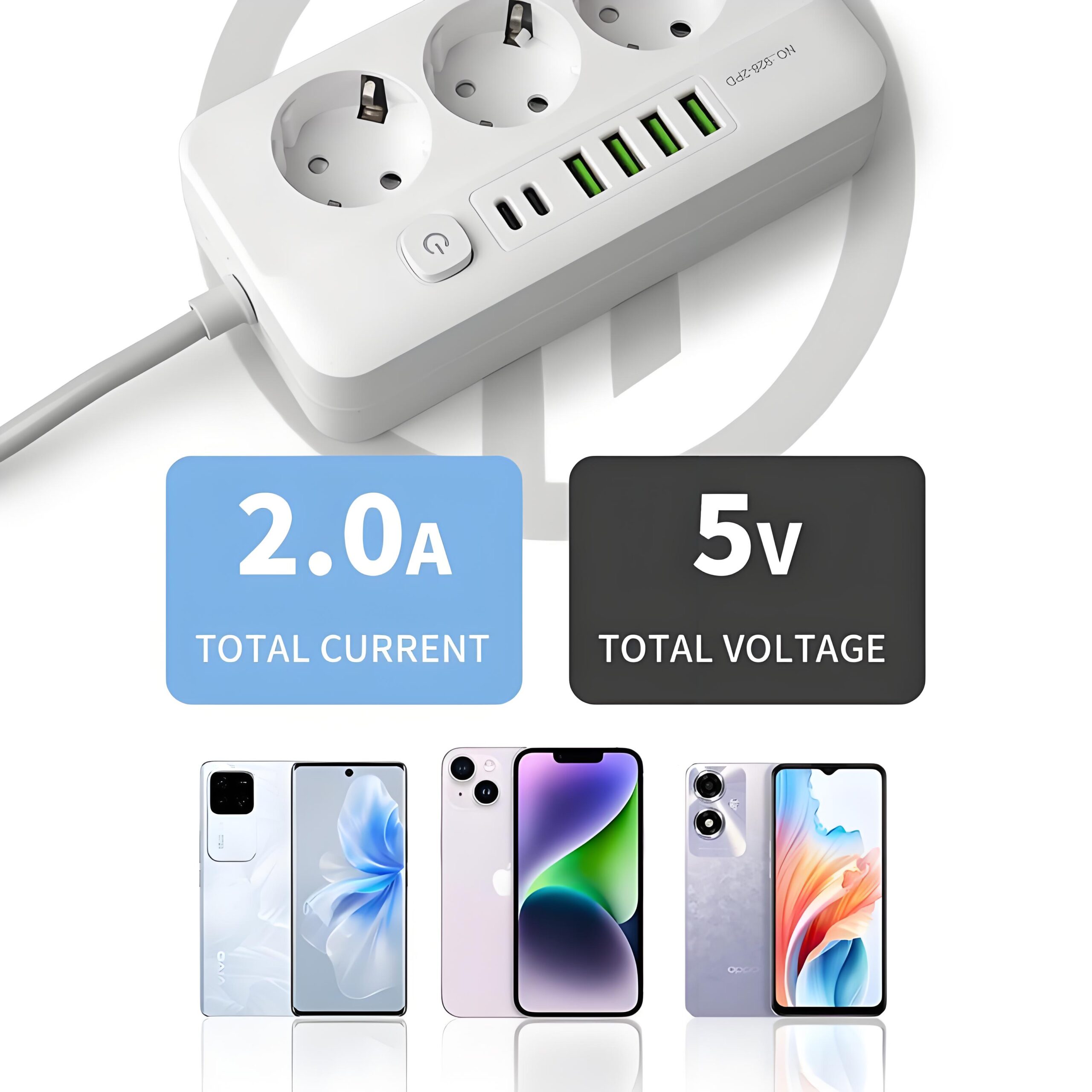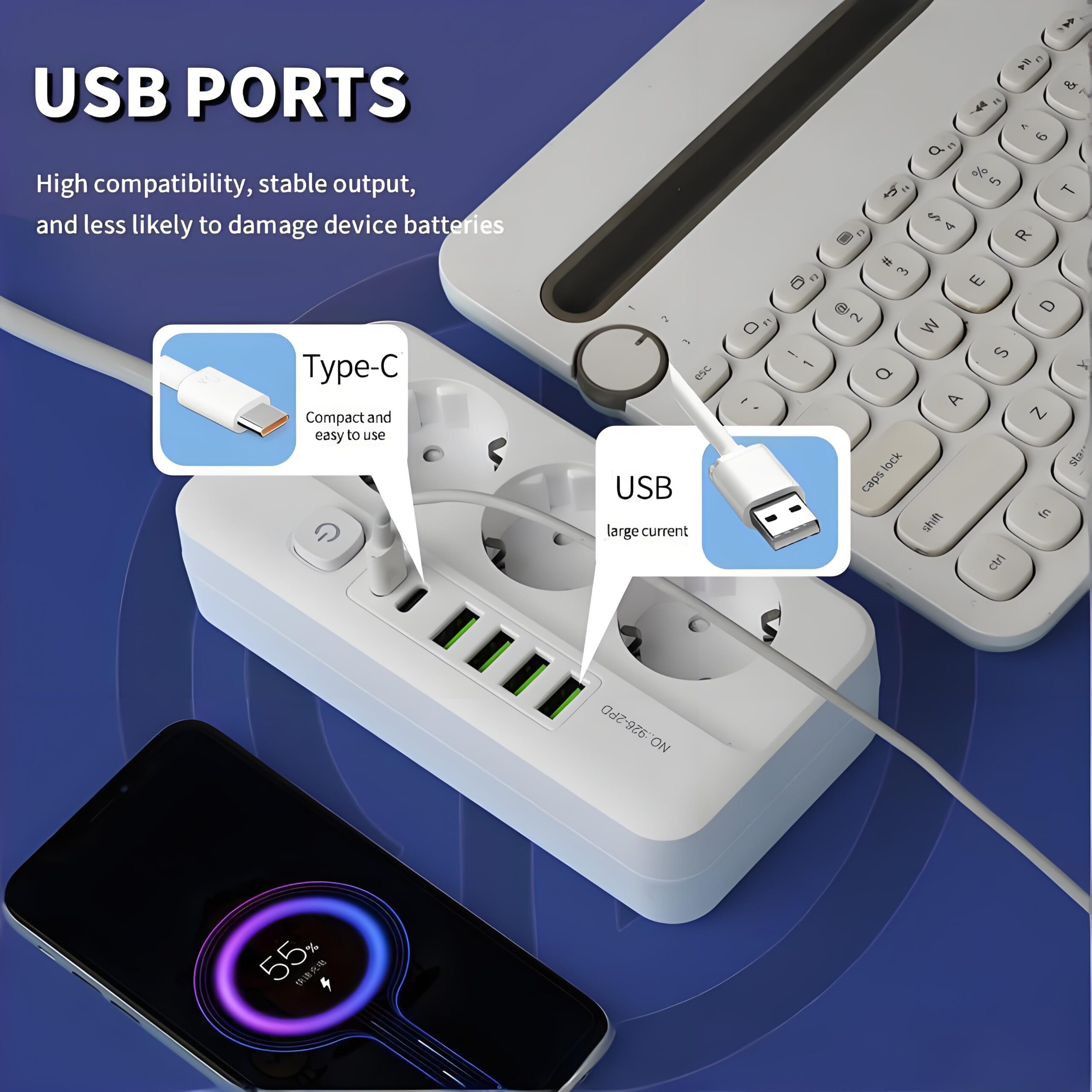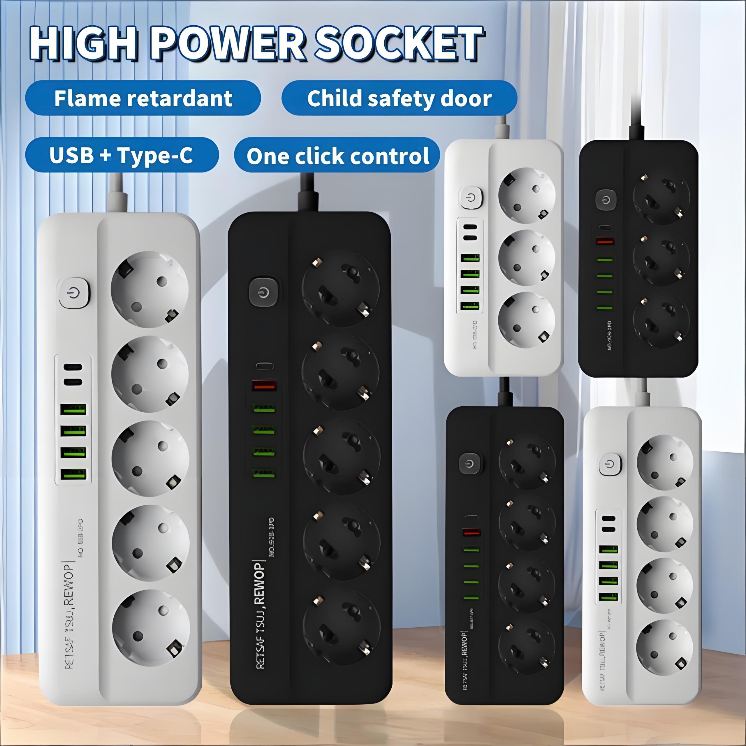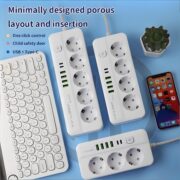 Built-in 4 grounded EU Type C/F sockets, fully compatible with all European standard plugs, stable power supply for home appliances, office devices, lamps, laptops and daily electronics.