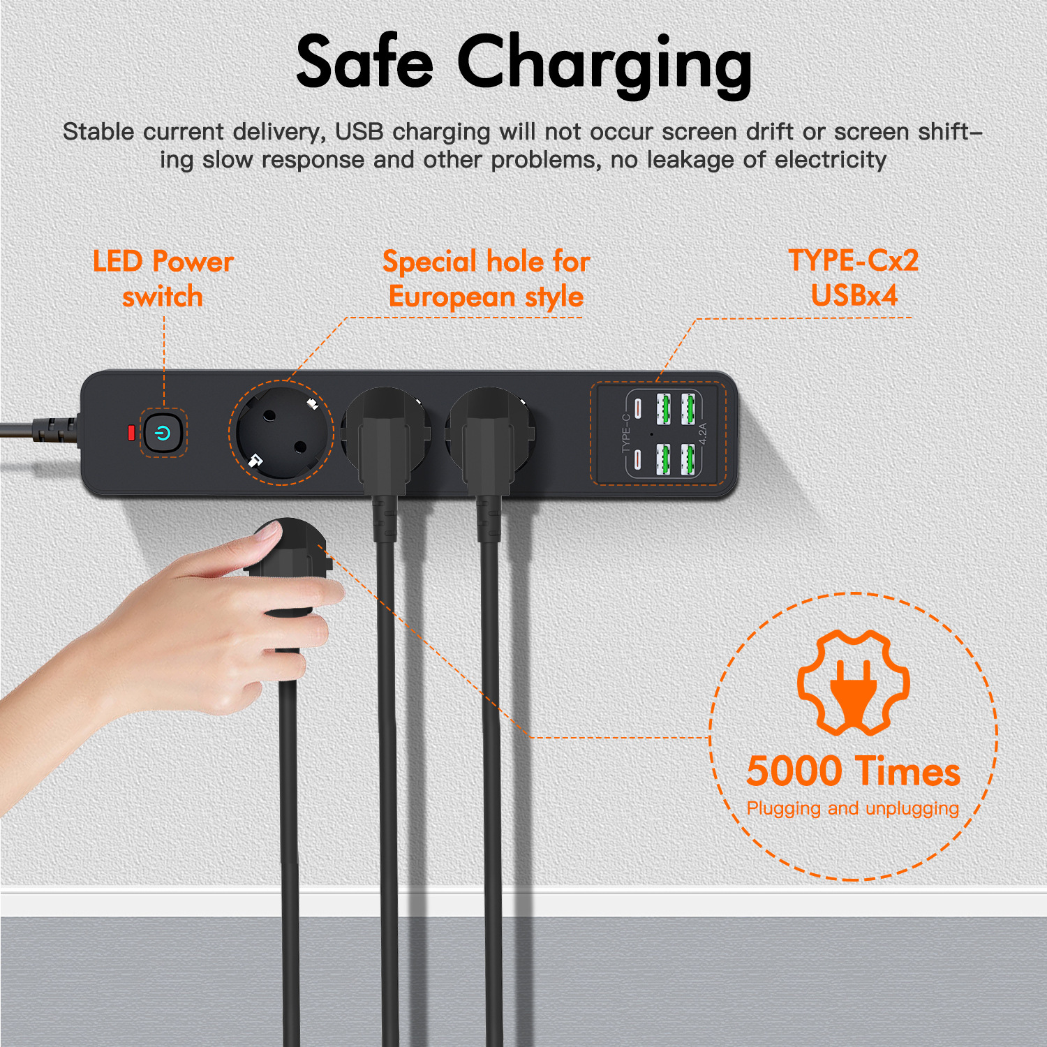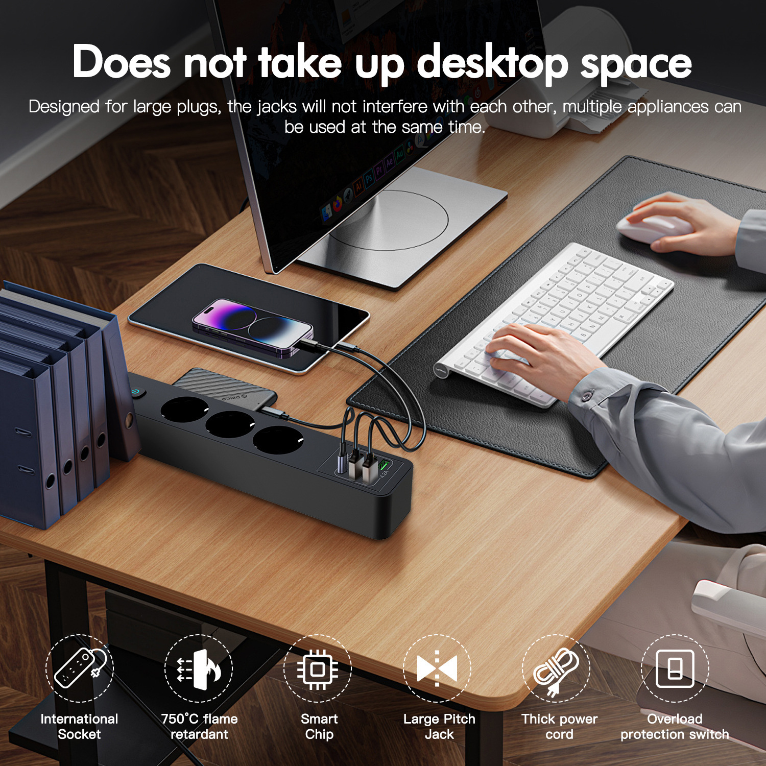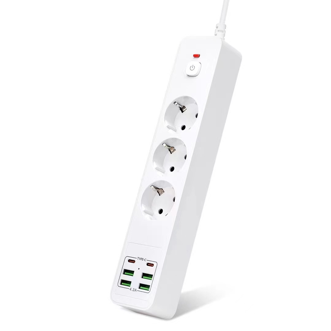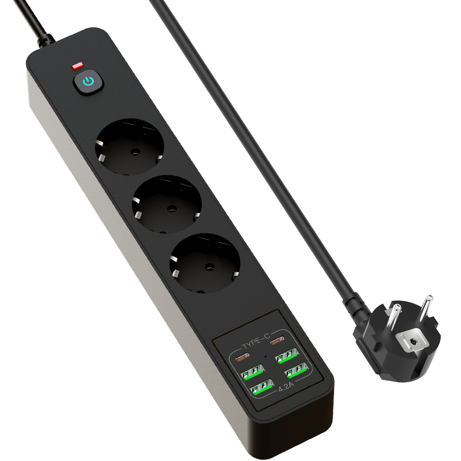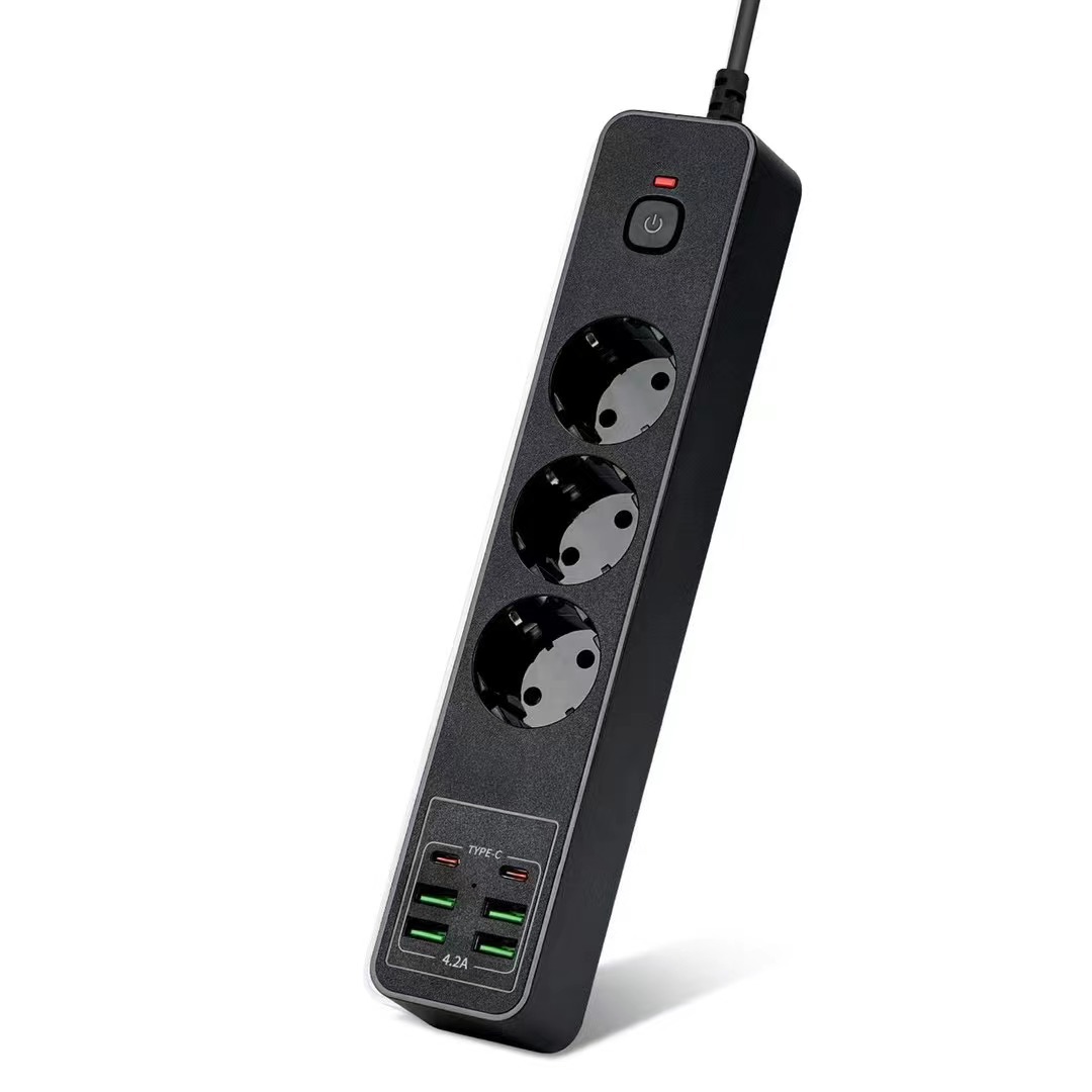 7-in-1 Design: 3 Schuko AC outlets + 2 USB-C ports + 2 USB-A ports, powering and charging all your devices simultaneously.