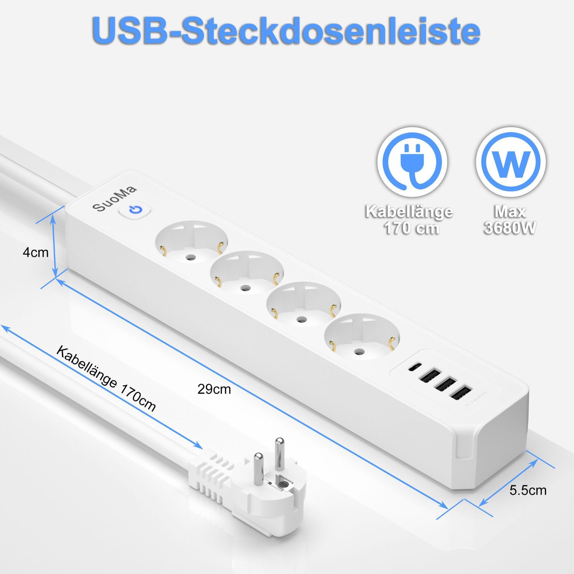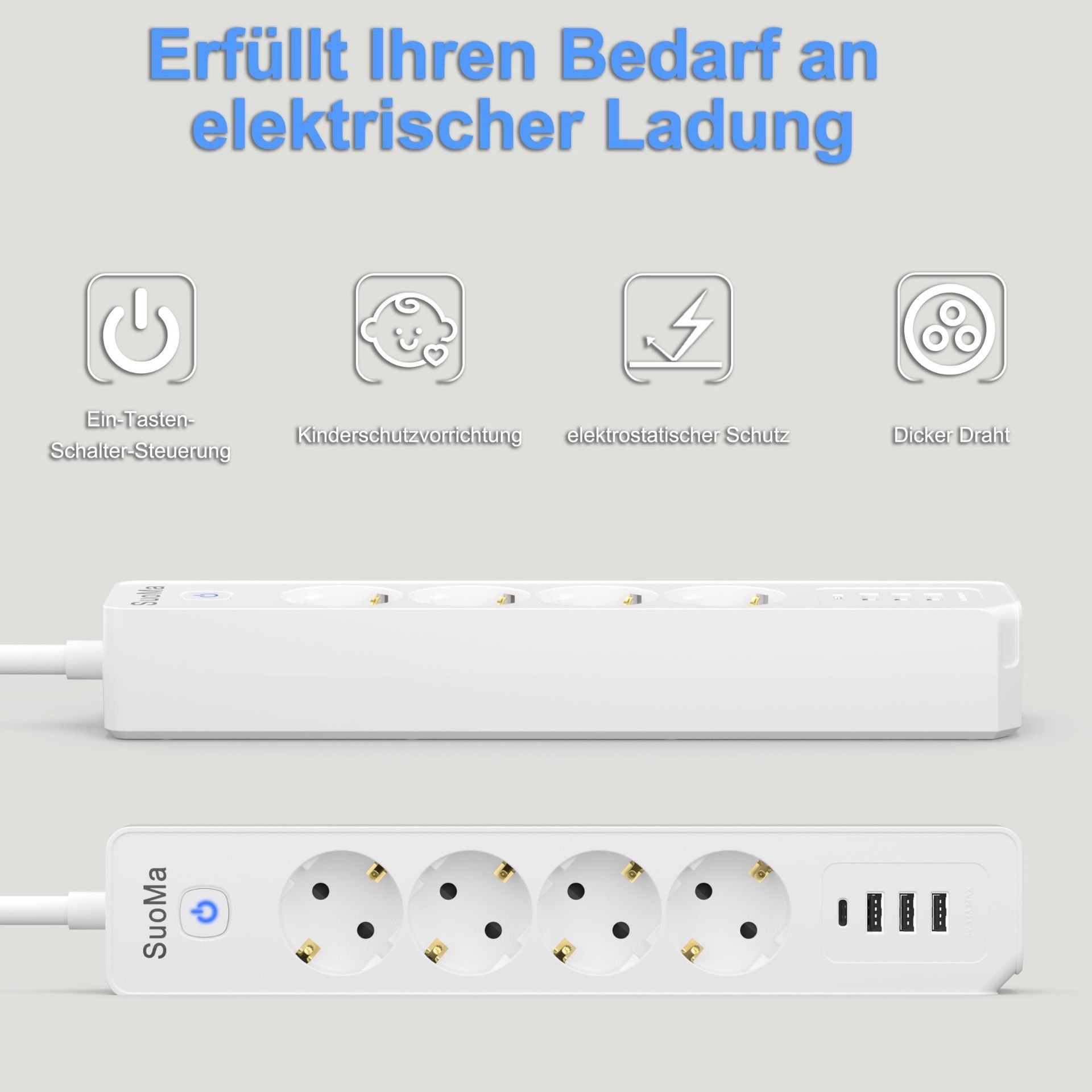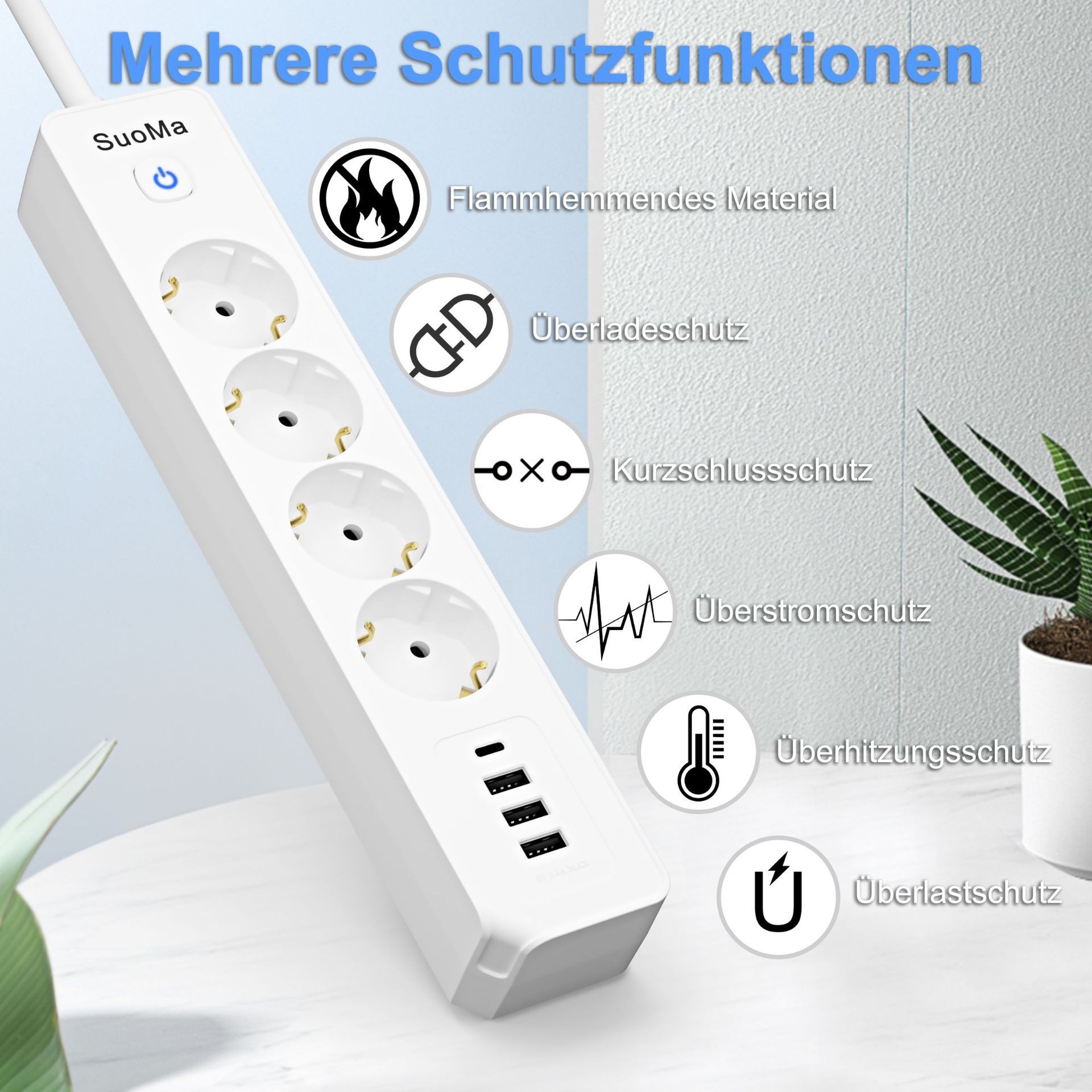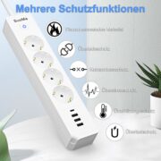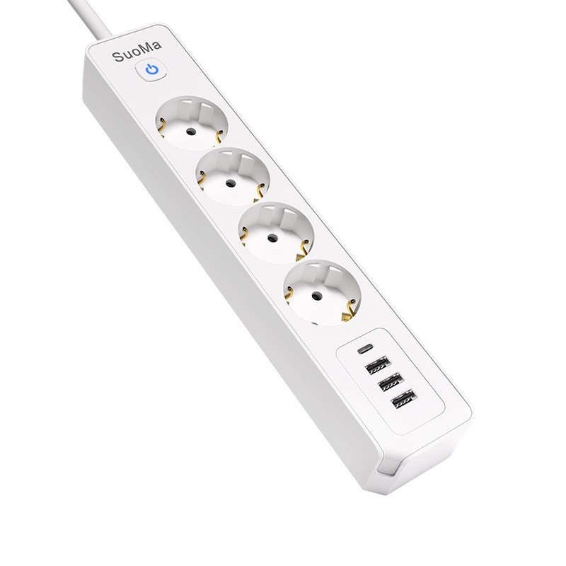 7-in-1 Design: 4 Schuko AC outlets + 1 USB-C port + 2 USB-A ports, powering and charging all your devices simultaneously.