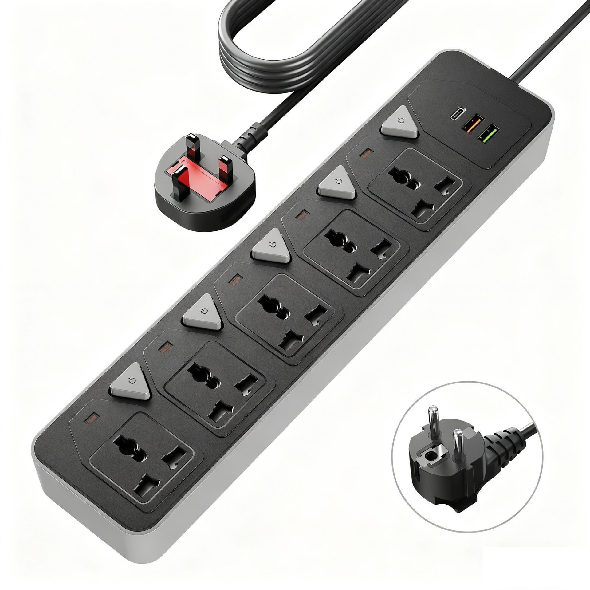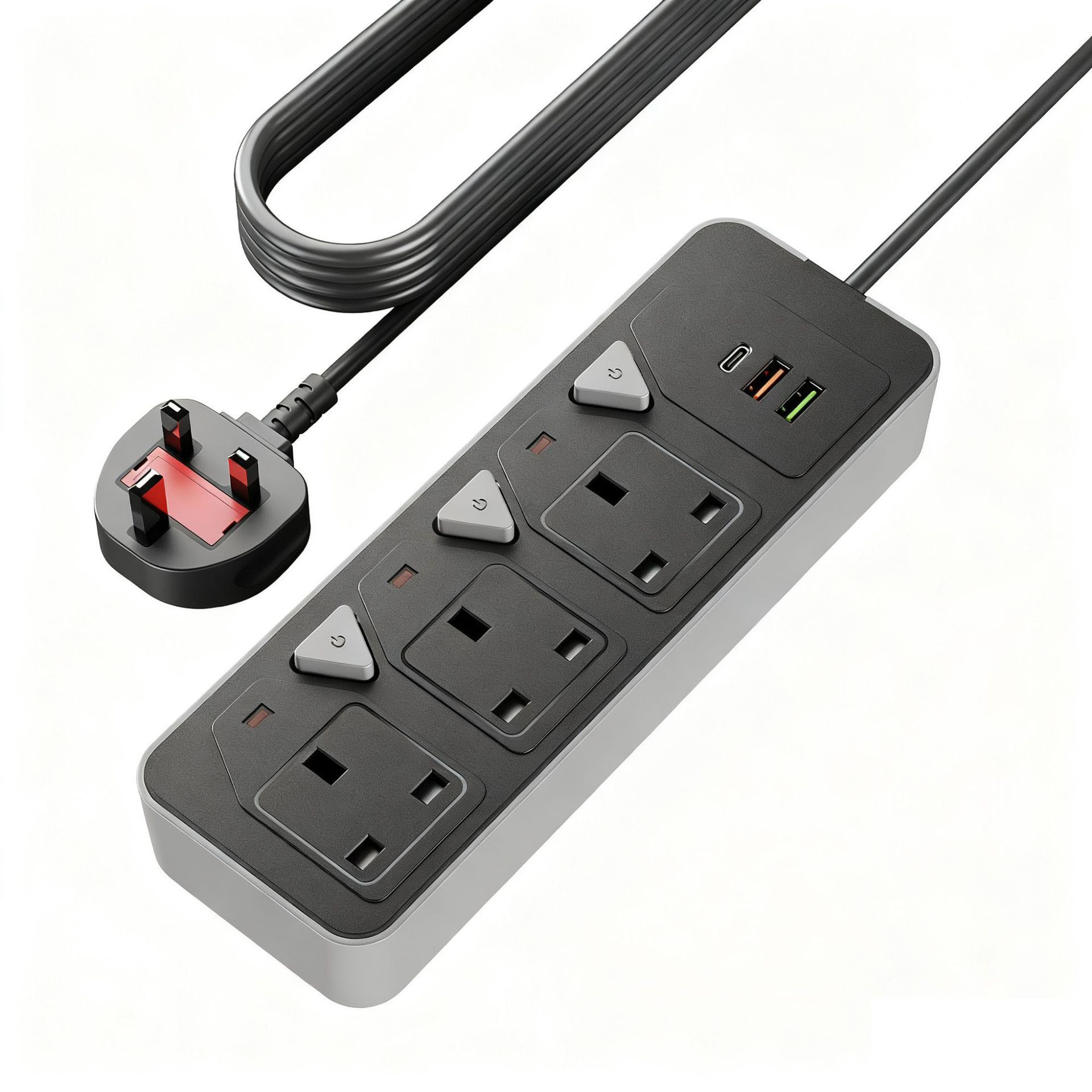 6-in-1 Fast Charging Hub: 3 UK BS1363 outlets + 1 PD USB-C (20W) + 1 QC 3.0 USB-A (18W), powering 6 devices at once ⚡