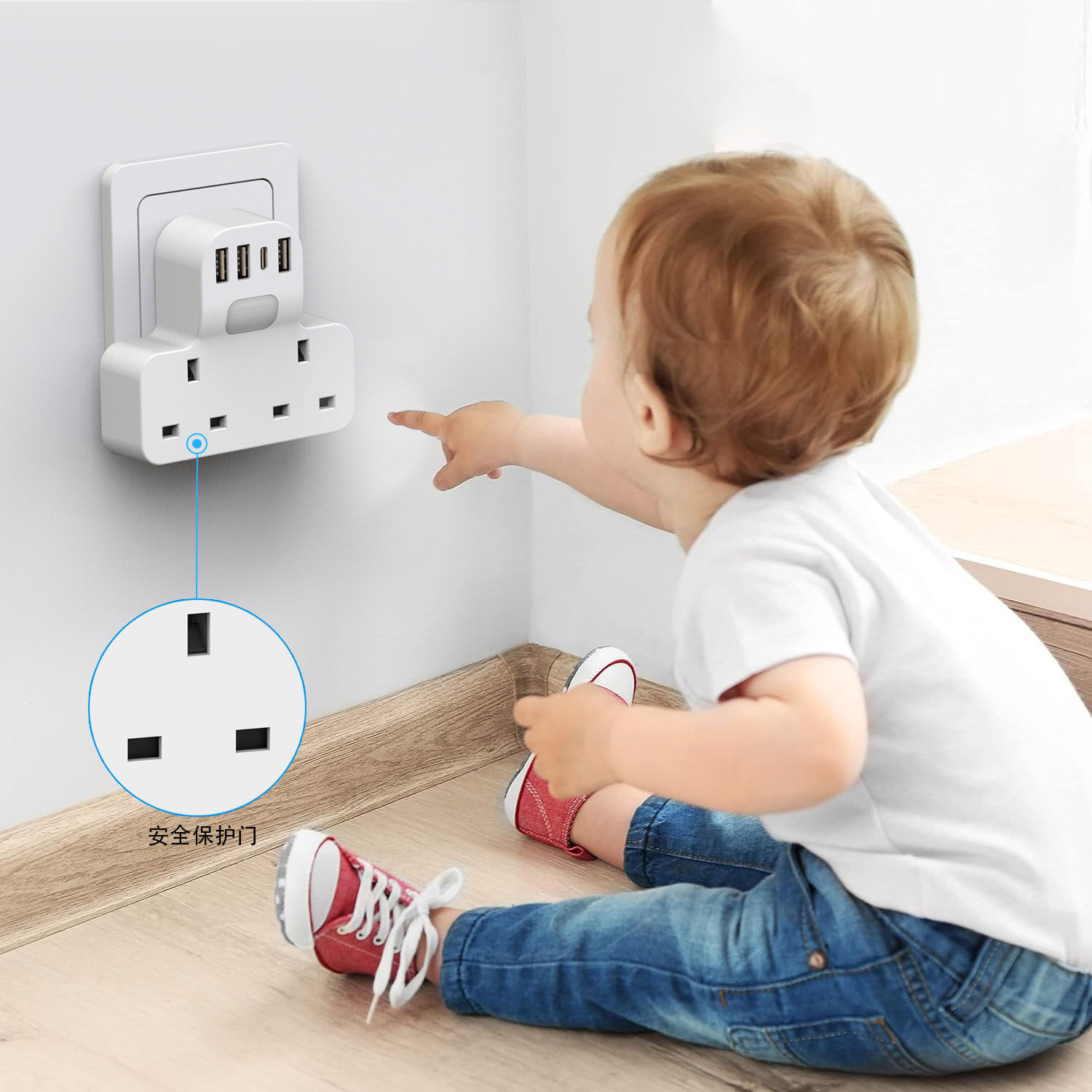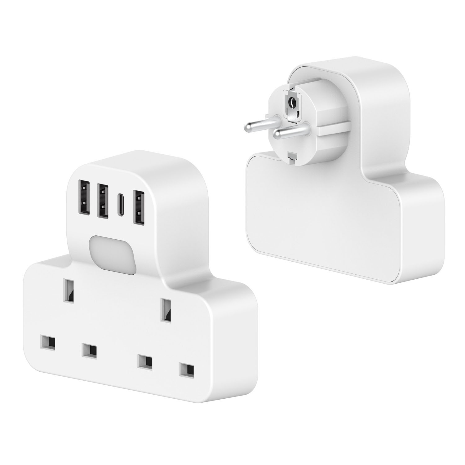 Convert EU Schuko (Type C/F) wall plug to 2 UK standard 3-pin sockets, perfect for using British standard electrical devices in Europe, ideal for travel, hotel, dormitory and office use.